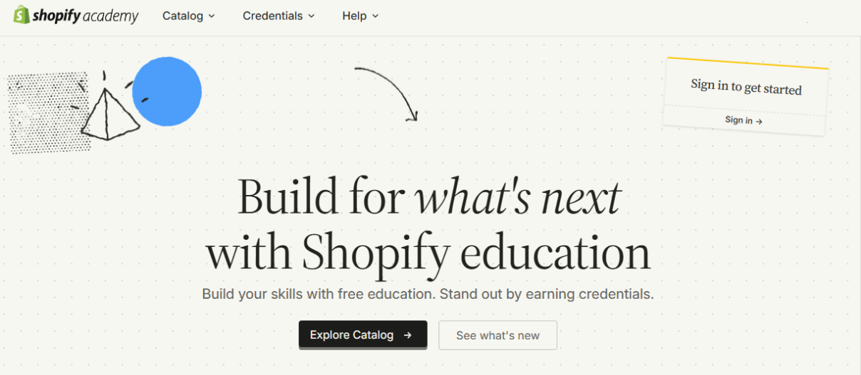Shopify Academy is Shopify’s free learning platform, offering courses and resources to help merchants build, manage and grow their online stores. The academy is ideal for learning Shopify best practices, understanding new features, and developing ecommerce skills at your own pace.